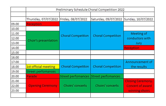 All the prizes, certificates and diplomas will be announced and handed in at a special ceremony in the presence of audience and authorities, where the choirs selected by the International Jury Committee will perform one (1) or two (2) songs also chosen by the I. J.C.